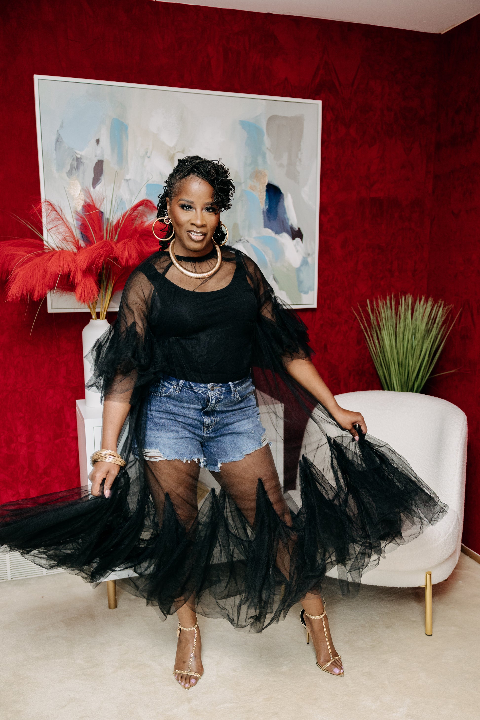 Where fantasy meets fashion. Sheer mesh bodice and sleeves flow into layers of dramatic black tulle with raw, cascading edges. The sheer silhouette invites creative styling—make it yours. For the woman who doesn't just attend events, she becomes them.