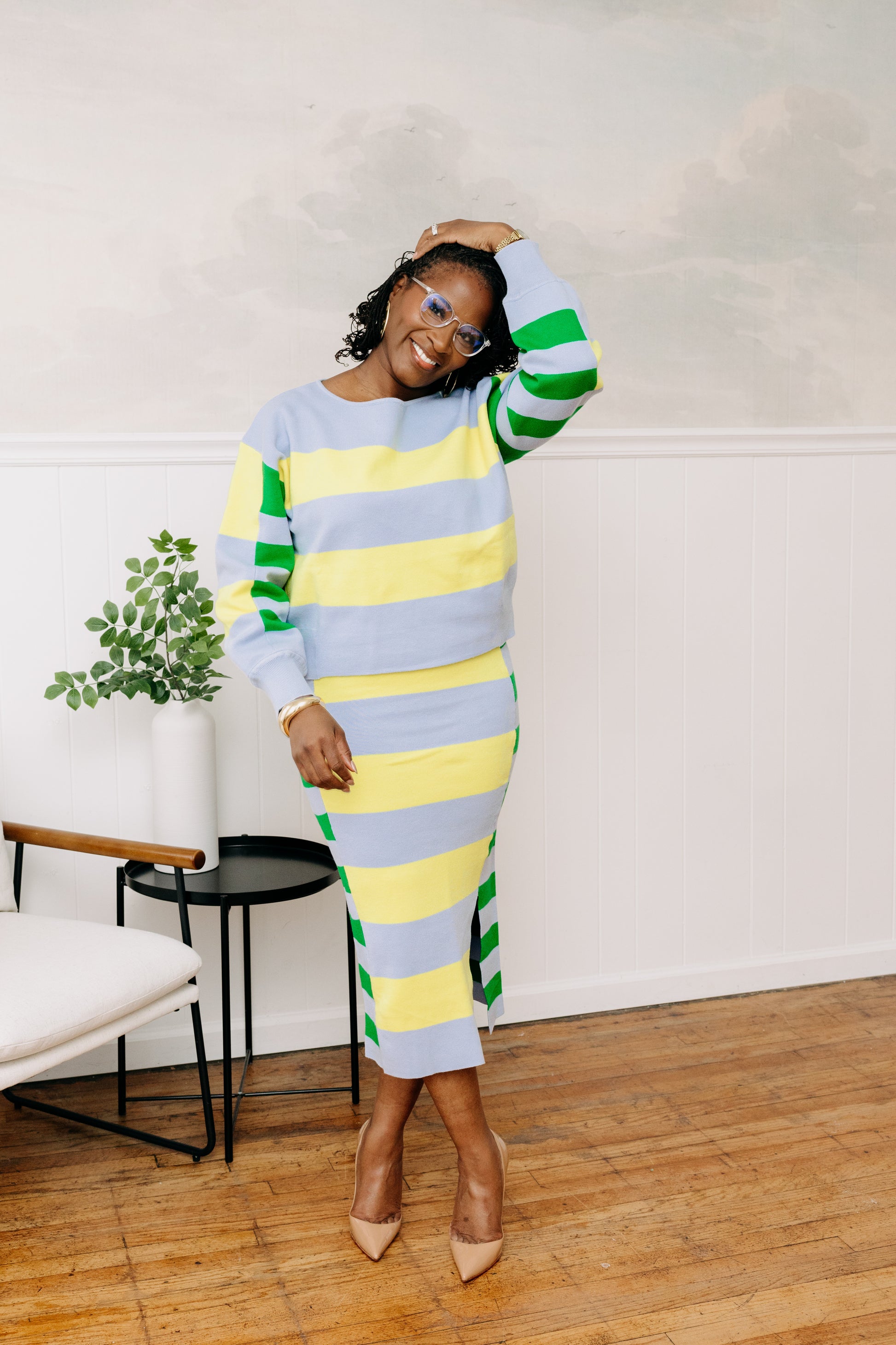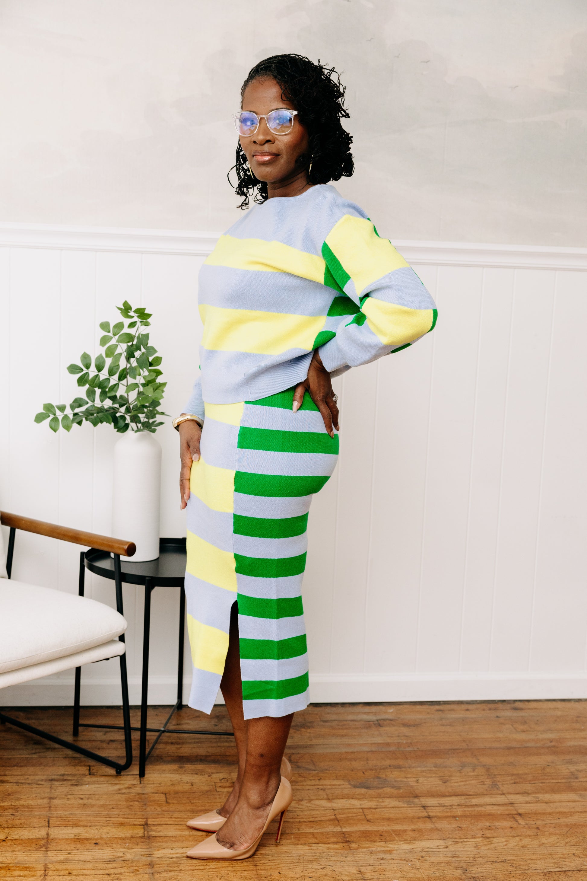Make an artistic statement in this two-piece set that elevates geometric design. The fresh interplay of stripes and color creates a sophisticated expression of modern style.